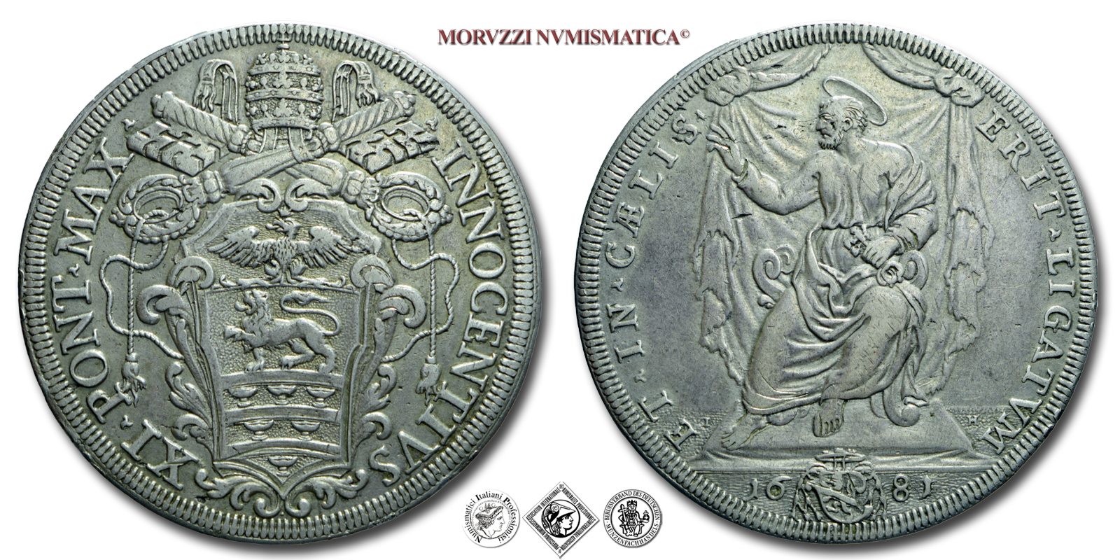 Stato Pontificio, INNOCENZO XI, Odescalchi, PIASTRA, 1681, ERIT LIGATVM ET IN CÆLIS San Pietro nimbato seduto benedice e tiene le chiavi oblique contro il ginocchio, Zecca di Roma, ARGENTO, BB, (R), (Muntoni 33) / monete papali pontificie rare d'argento