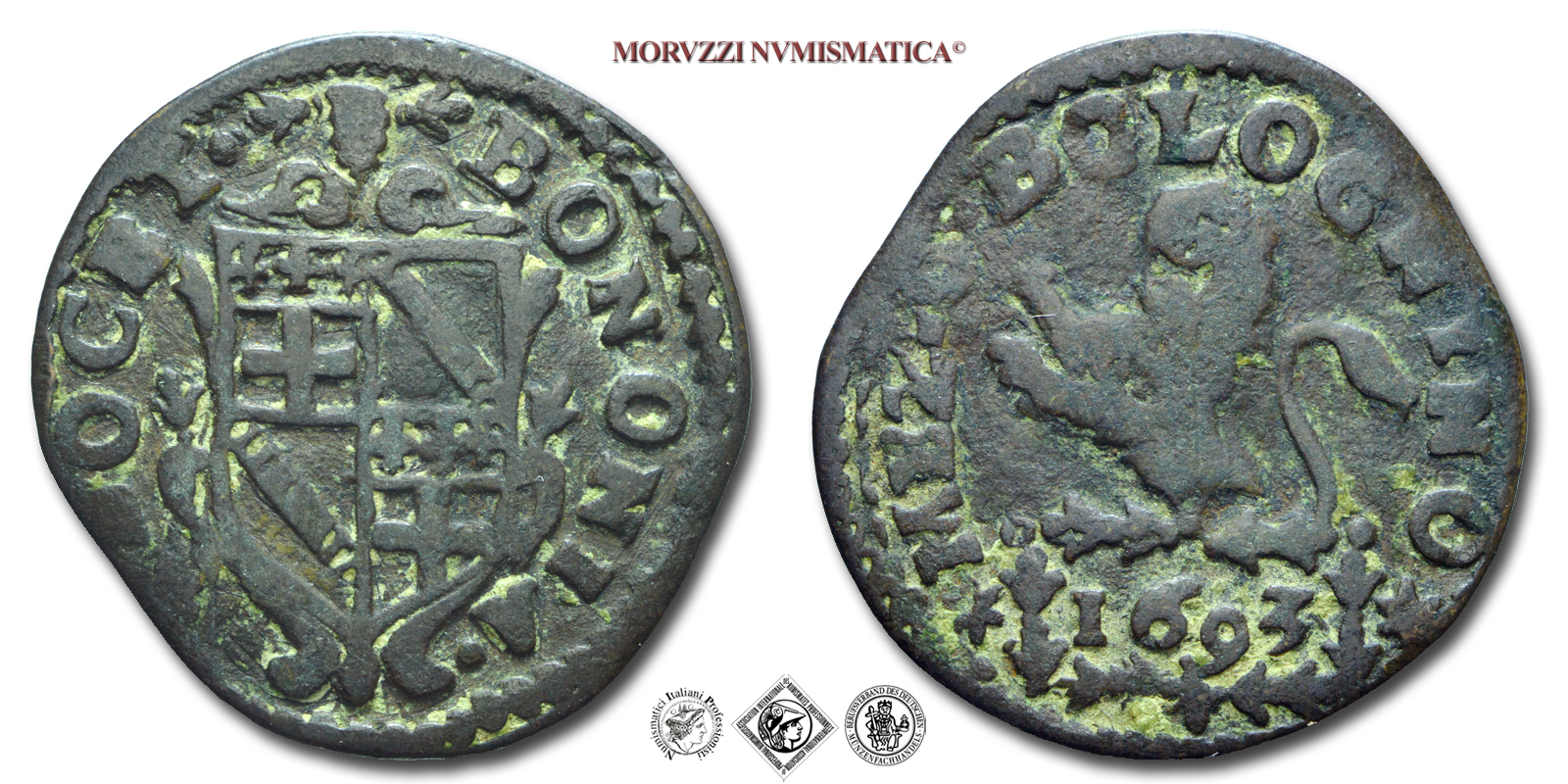 Stato Pontificio, INNOCENZO XII, Pignatelli, 1/2 BOLOGNINO, 1693, BONONIA • * DOCET • Stemma della città di Bologna / * MEZO BOLOGNINO * Leone, Zecca di Bologna, BRONZO, qBB, (R), (CNI 53) / monete papali rare d'argento (monete pontificie)