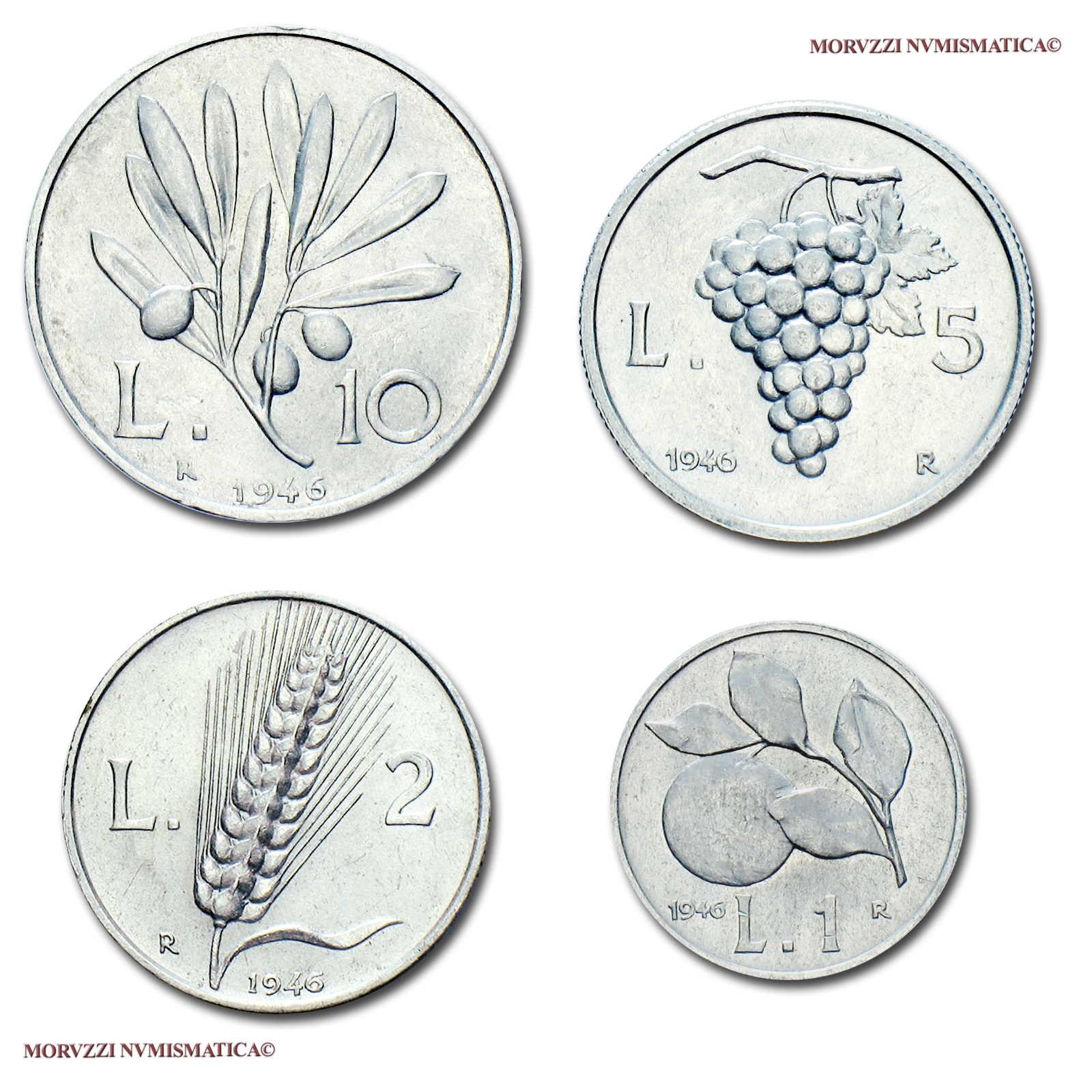 Repubblica Italiana, Serie completa composta da 1 lira Arancia, 2 lire Spiga, 5 lire Uva e 10 lire Olivo, 1946 - OFFERTA SPECIALE