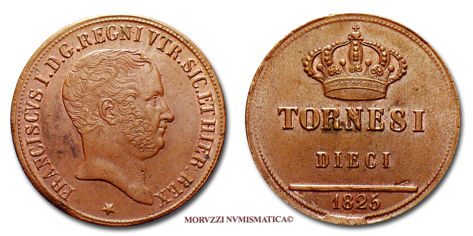 Regno delle due Sicilie, FRANCESCO I DI BORBONE, 10 TORNESI, 1825, zecca di Napoli, qFDC, (R), (Pagani 119e) / monete italiane preunitarie moderne rare (moneta da tornesi dieci di rame rara da collezione) - OFFERTA SPECIALE