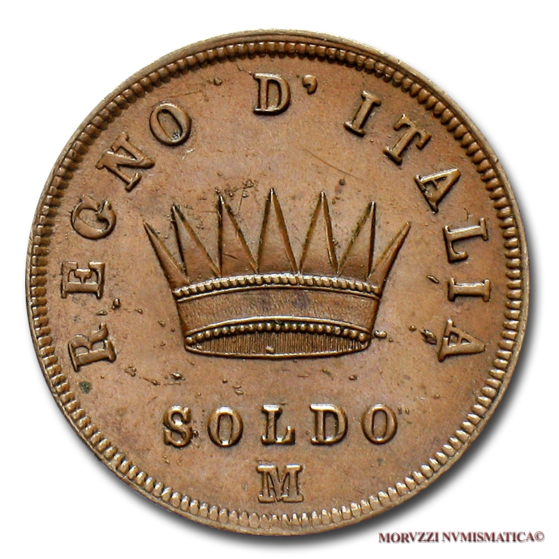 Milano, NAPOLEONE I, Re d'Italia, SOLDO, Emissione: 1811 M, D/ NAPOLEONE IMPERATORE E RE, testa nuda a s.; in basso, nel giro: data (1811) tra il segno di zecca (melagrana) e un lume ad olio, R/ REGNO D'ITALIA, nel campo: corona ferrea radiata (simbolo del Sacro Romano Impero) / SOLDO / lettera identificativa di zecca (M), Zecca di Milano, Rif. bibl. Pagani, 76; Metallo: CU, gr. 10,12, (MZ71963), Diam.: mm. 27,25, mSPL