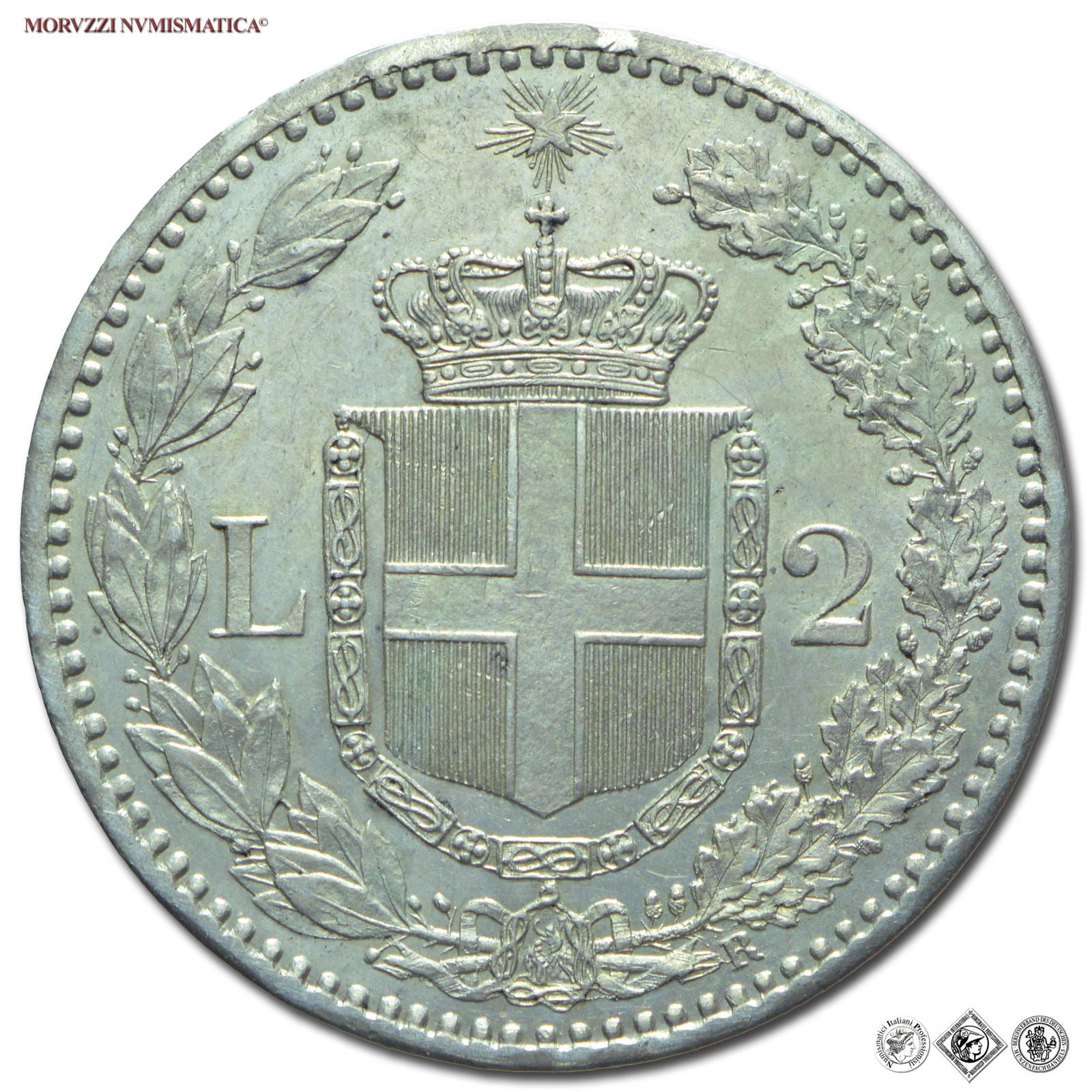 Regno d'Italia, UMBERTO I, 1878-1900, 2 LIRE, Emissione: 1881, D/ testa nuda del Re volta a destra contornata dalla scritta UMBERTO I RE D'ITALIA e la data (1881). Sotto al collo del Re il nome dell'autore: SPERANZA, R/ stemma Sabaudo contornato da rami di alloro e dal valore (L • 2). In basso a ore cinque il segno di zecca (R). In alto la stella d'Italia, Zecca di Roma, Rif. bibl. Pagani, 591; Metallo: AR, gr. 9,99, (MI30299), Diam.: mm. 27,07, qFDC
