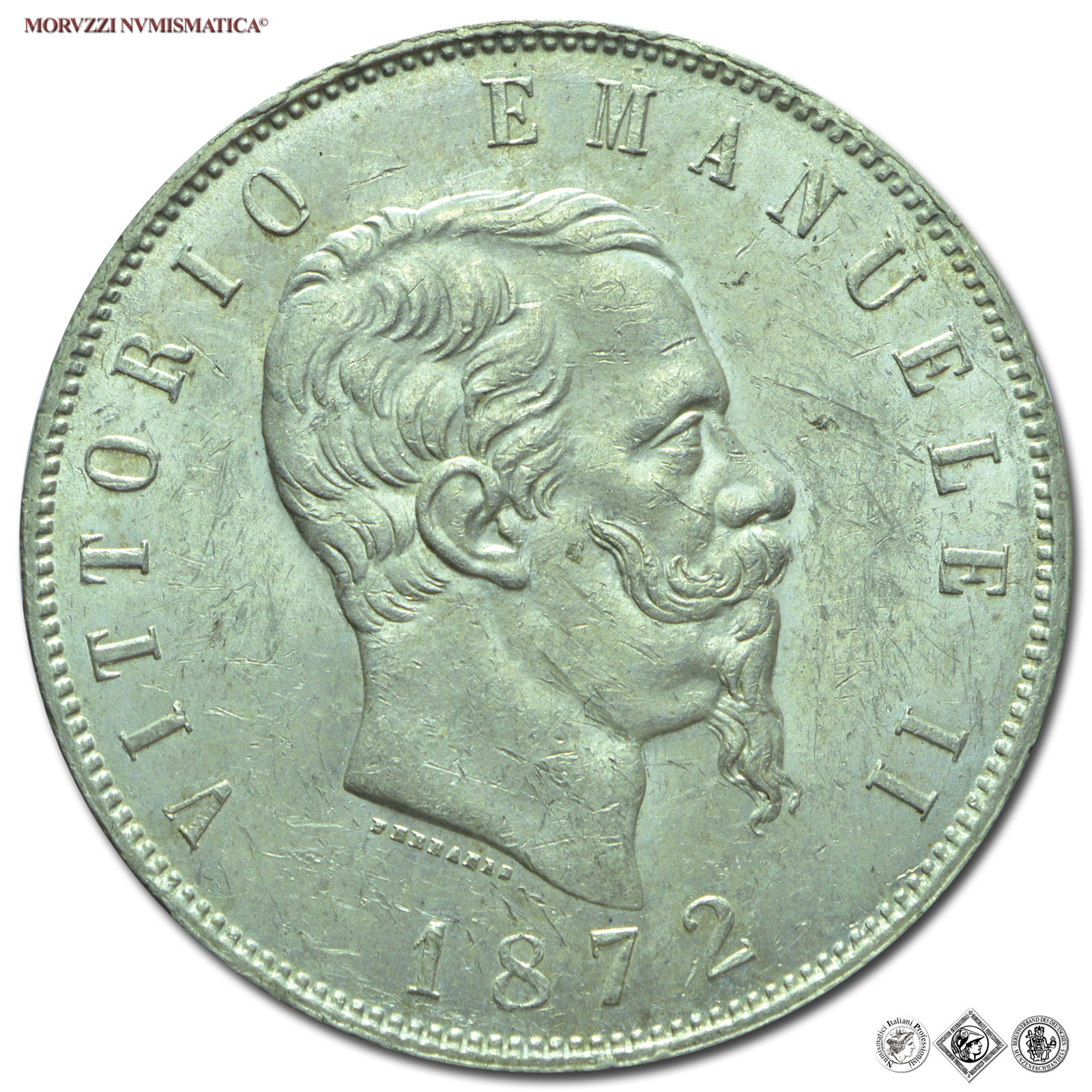 Emissione: 1872 M, Zecca di Milano, Rif. bibl. Pagani, 494; Metallo: AR, gr. 24,99, (MI67570), Diam.: mm. 37,03, qFDC