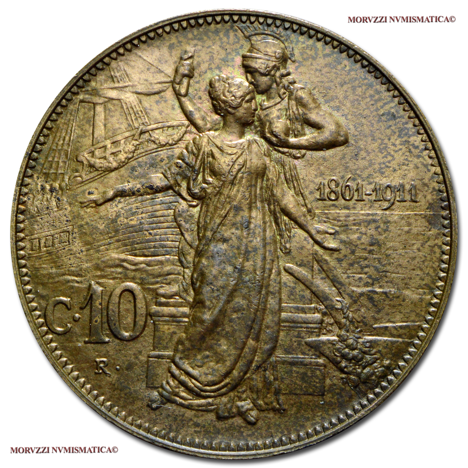 Regno d'Italia, VITTORIO EMANUELE III, 1900-1943, 10 CENTESIMI, Cinquantenario, Emissione: 1911, D/ VITTORIO EMANUELE III RE D'ITALIA, testa nuda del Re a s.; sotto il collo: i nomi dell'autore (D • TRENTACOSTE) e dell'incisore (L • GIORGI INC •), R/ due figure allegoriche che simboleggiano l'Italia (la figura femminile) e la città di Roma (la figura maschile posta su di un piedistallo al cui lato si intravede un aratro); sullo sfondo: la prora di una nave mercantile; nel campo, a d.: le date 1861-1911; nel campo, a s: l'indicazione del valore (C • 10) e sotto il segno di zecca (R •), Zecca di Roma, Rif. bibl. Pagani, 863; Metallo: CU, gr. 9,92, (MI120313), Diam.: mm. 30,16, FDC