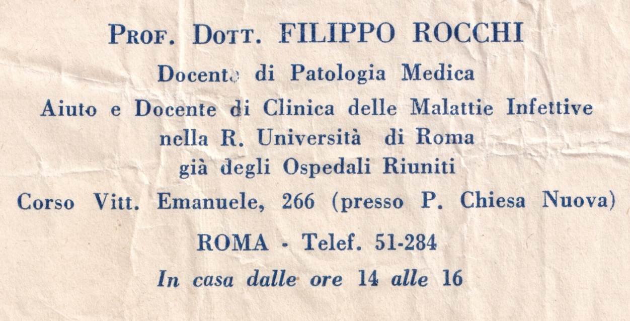 Il prof. Filippo Rocchi era nato a Roma nel 1900 da una famiglia di antiche tradizioni nel campo della medicina: medico il padre, chirurgo il nonno, lui stesso grande clinico e padre poi a sua volta di due medici, un chirurgo ed un internista.