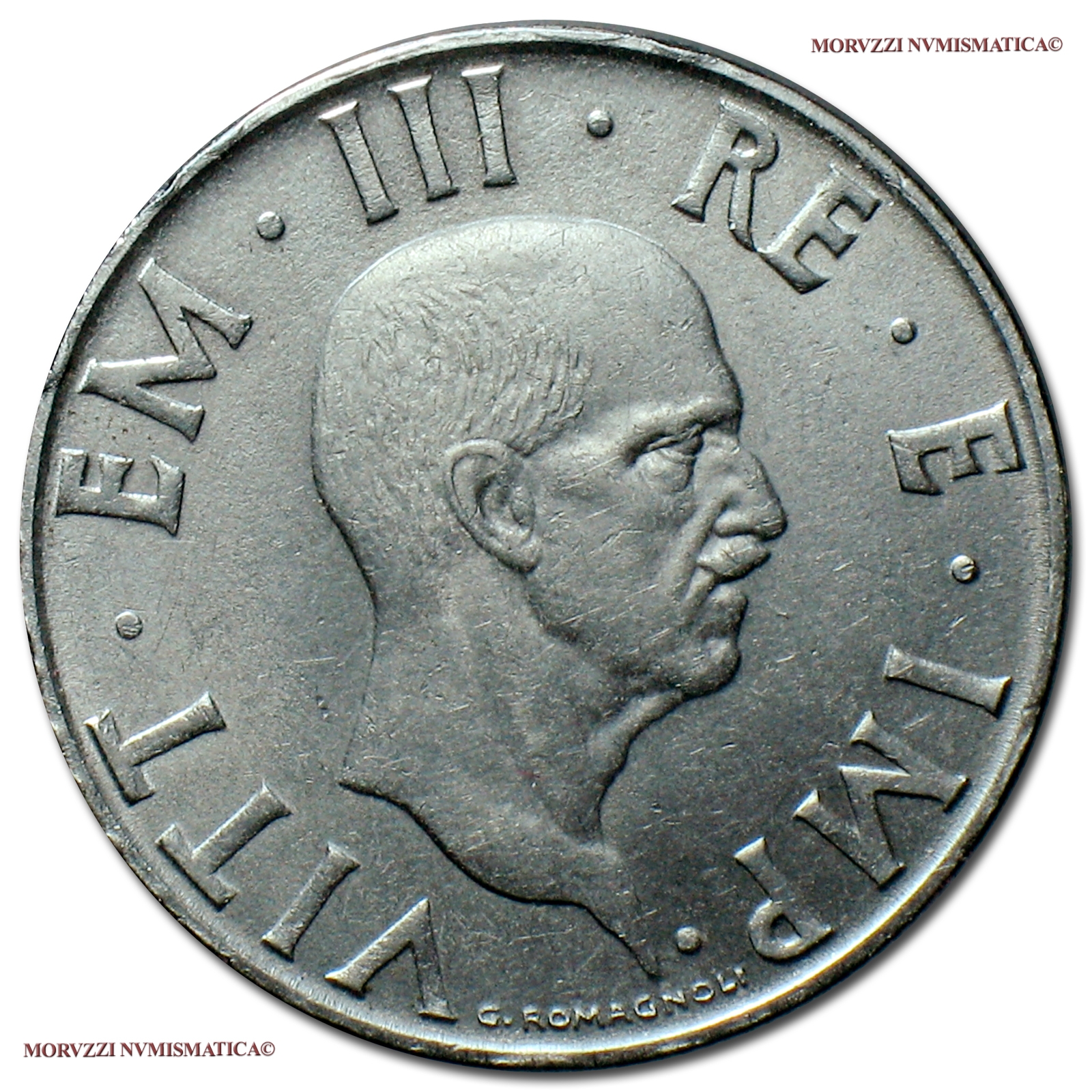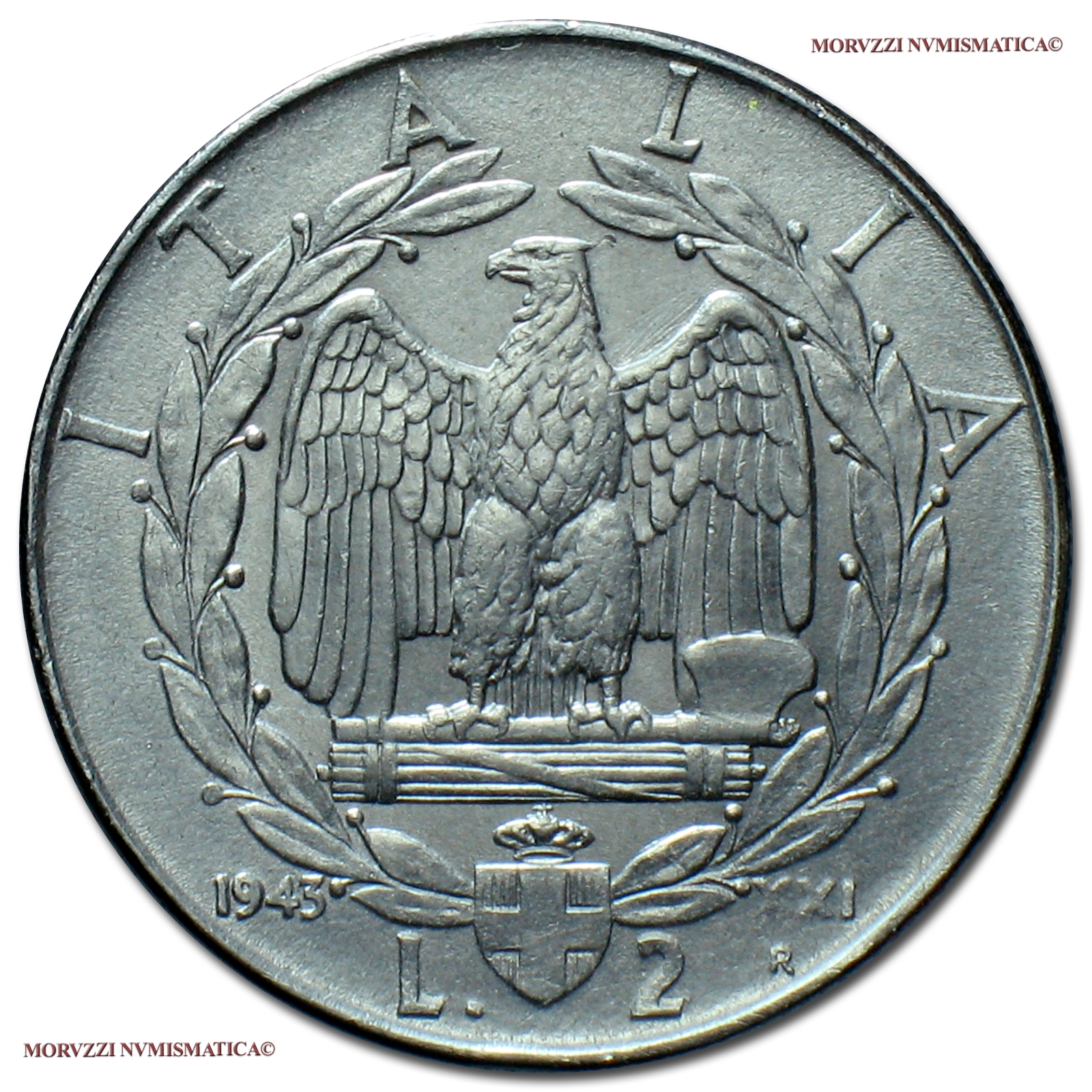 Regno d'Italia, VITTORIO EMANUELE III, 1900-1943, 2 LIRE, Impero, Emissione: 1943 XXI, D/ VITT • EM • III • RE • E • IMP •, testa nuda del Re a s.; G • ROMAGNOLI (autore) in basso lungo il bordo, R/ ITALIA, aquila con ali spiegate e fascio tra gli artigli all'interno di una corona di alloro; in basso stemma sabaudo tra L. 2 con 1943 nel campo a s. e XXI / R (segno di zecca) nel campo a d., Zecca di Roma, Rif. bibl. Pagani, 762; Metallo: NI, gr. 9,91, (MI138494), Diam.: mm. 29,07, mBB, (R)