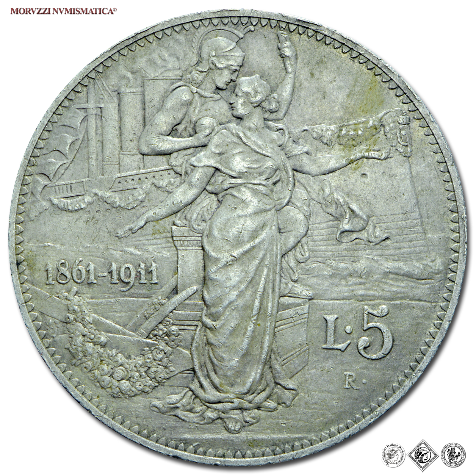 Regno d'Italia, VITTORIO EMANUELE III, 1900-1943, 5 LIRE (SCUDO), Cinquantenario, Emissione: 1911, D/ VITTORIO EMANUELE III RE D'ITALIA, testa nuda del Re a s.; sotto il collo i nomi dell'autore (D. TRENTACOSTE) e dell'incisore (L. GIORGI INC.), R/ due figure allegoriche che simboleggiano l'Italia (la figura femminile) e la città di Roma (la figura maschile posta su di un piedistallo). Sullo sfondo la prora di una nave a vapore. A s. un aratro ornato con una ghirlanda di fiori a cui sono sovrapposte le date 1861-1911. A d. l'indicazione del valore (L • 5) e sotto il segno di zecca (R •), Zecca di Roma, Rif. bibl. Pagani, 707; Metallo: AR, gr. 25,12, (MI130276), Diam.: mm. 37,17, mSPL, (R)