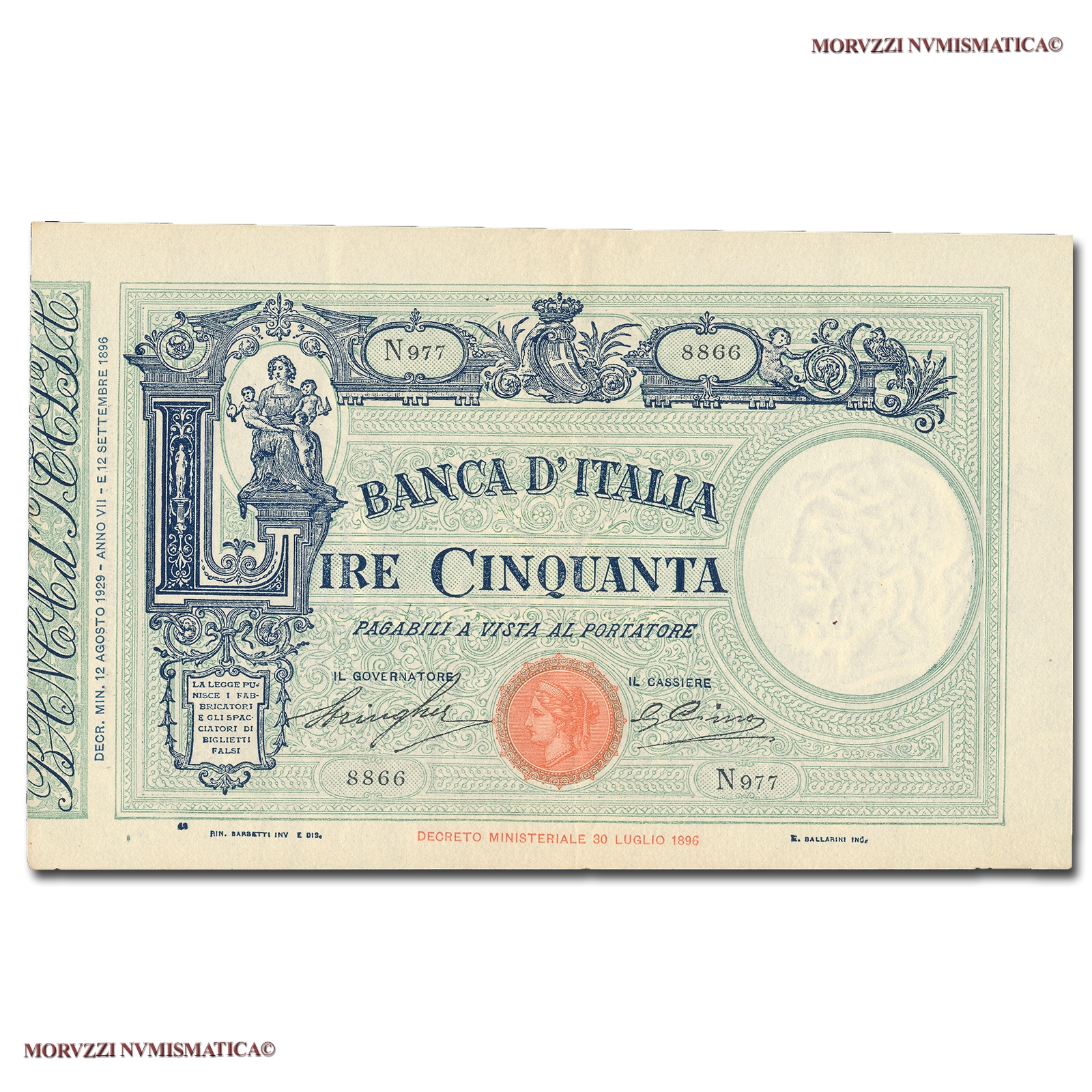 Italia, Vittorio Emanuele III, BANCA D'ITALIA, 50 LIRE, Barbetti - contrassegno: fascio, 12.08.1929, D/ nella s., figura femminile personificante l'Arte seduta su una grande "L" con due putti tra le braccia; in alto, nel centro: stemma sabaudo coronato, R/ nell'ovale d., testa dell'Italia turitta e putti nell'ornato, Rif. bibl. Crapanzano, 82; (CM51294), Firme: Stringher, Cima, n° di serie: N977 8866, qFDS