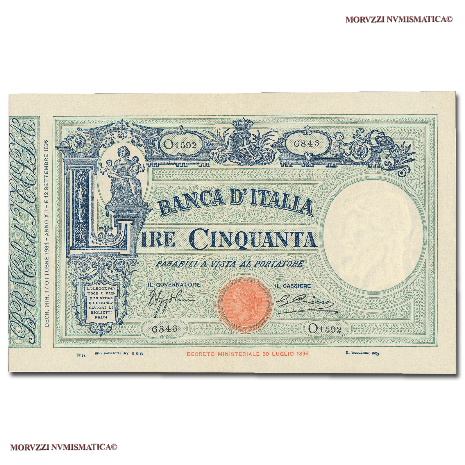 Italia, Vittorio Emanuele III, BANCA D'ITALIA, 50 LIRE, Barbetti - contrassegno: fascio, 17.10.1934, D/ nella s., figura femminile personificante l'Arte seduta su una grande "L" con due putti tra le braccia; in alto, nel centro: stemma sabaudo coronato, R/ nell'ovale d., testa dell'Italia turitta e putti nell'ornato, Rif. bibl. Crapanzano, 98; (CM87895), Firme: Azzolini, Cima, n° di serie: O 1592 6843, qFDS