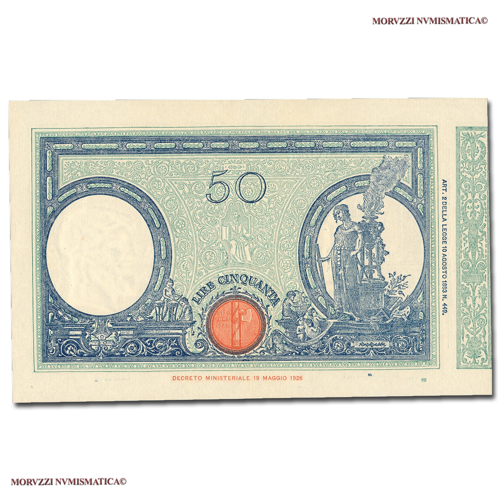 Filigrana: Nell'ovale testa di Nettuno con tridente, nel centro del biglietto "L.50".