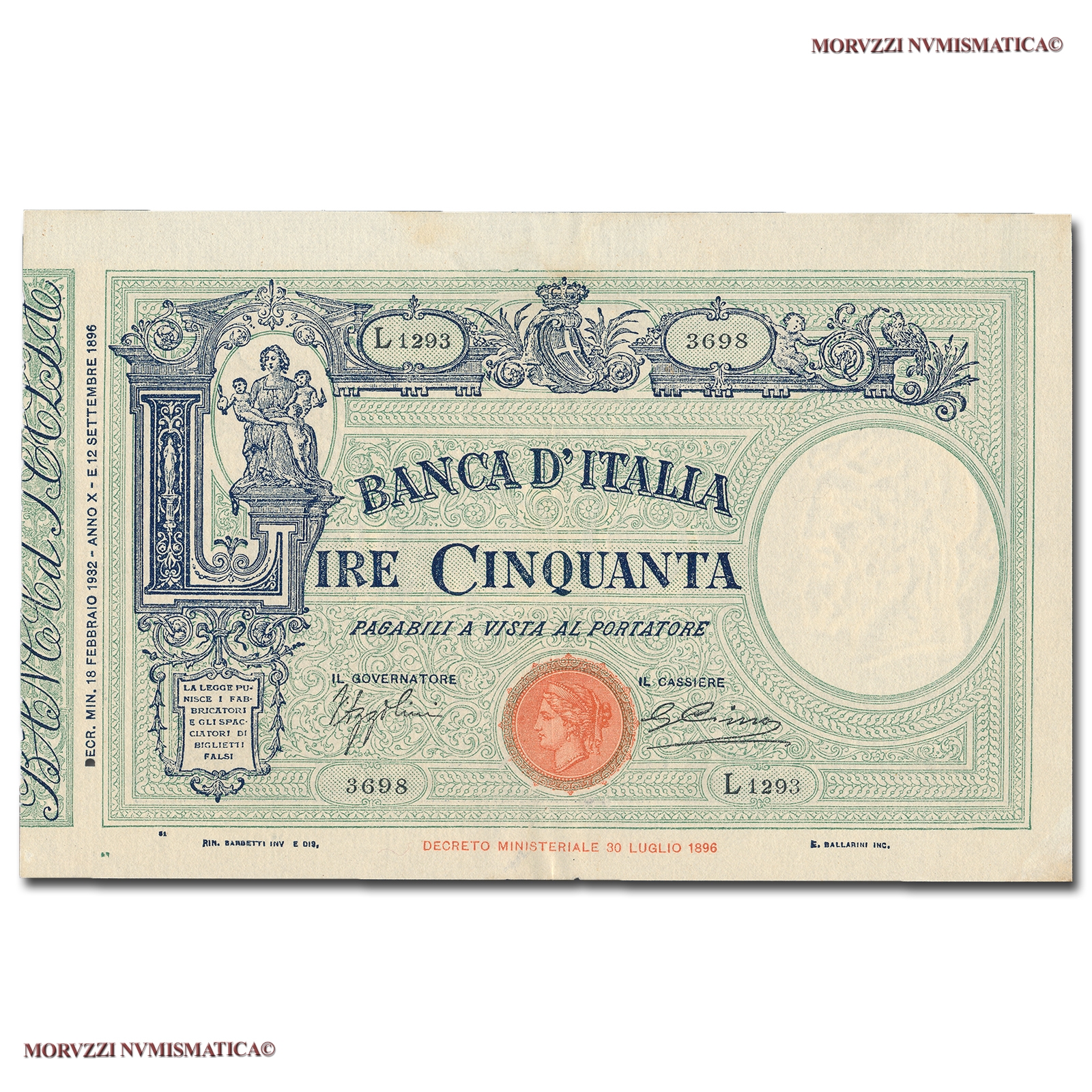 Italia, Vittorio Emanuele III, BANCA D'ITALIA, 50 LIRE, Barbetti - contrassegno: fascio, 18.02.1932, D/ nella s., figura femminile personificante l'Arte seduta su una grande "L" con due putti tra le braccia; in alto, nel centro: stemma sabaudo coronato, R/ nell'ovale d., testa dell'Italia turitta e putti nell'ornato, Rif. bibl. Crapanzano, 90; (CM10747), Firme: Azzolini, Cima, n° di serie: L 1293 3698, qSPL