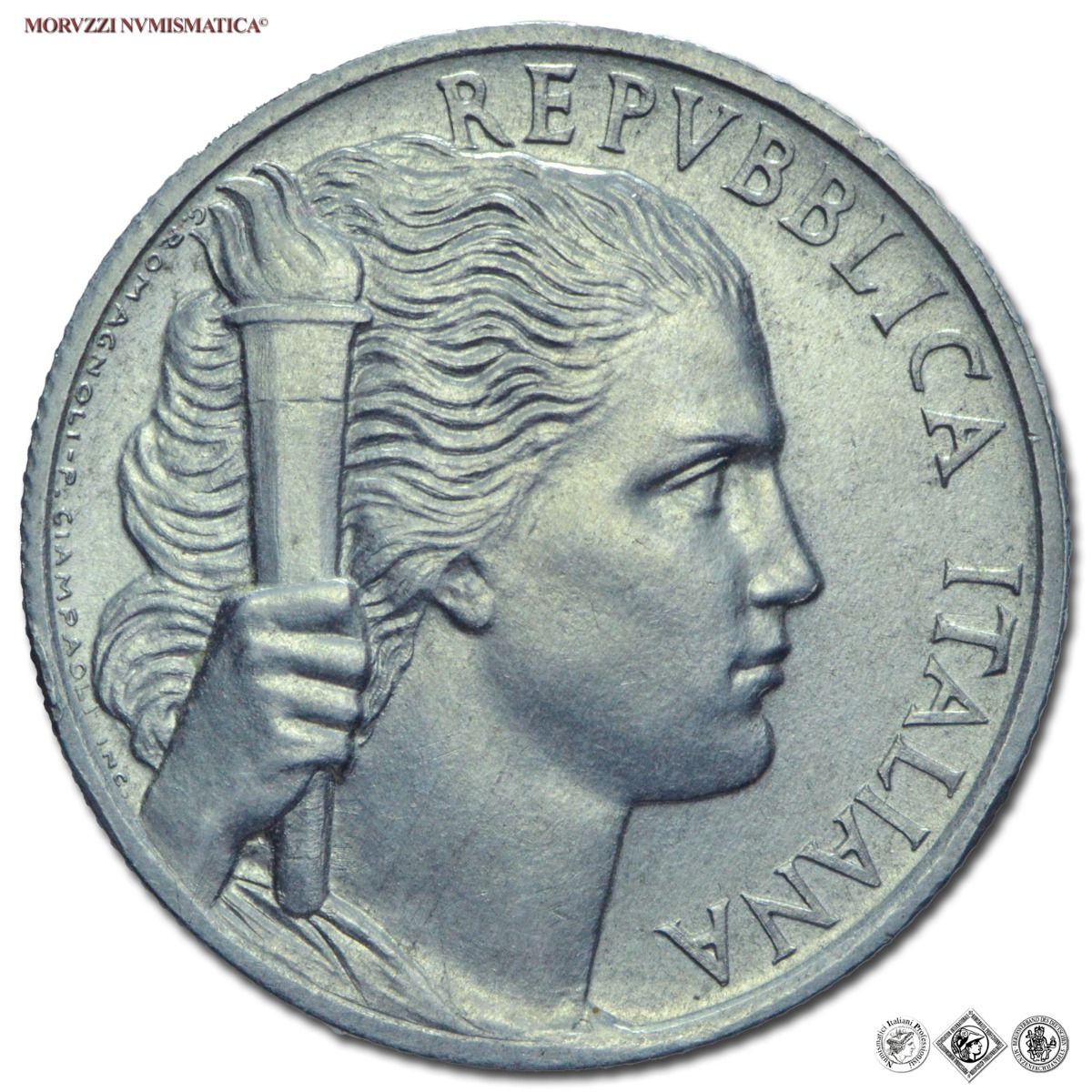 Emissione: 1946, Zecca di Roma, Rif. bibl. Pagani, 2351 var.; Metallo: IT, gr. 2,50, (MI111615), Diam.: mm. 26,72, FDC, (RRR)