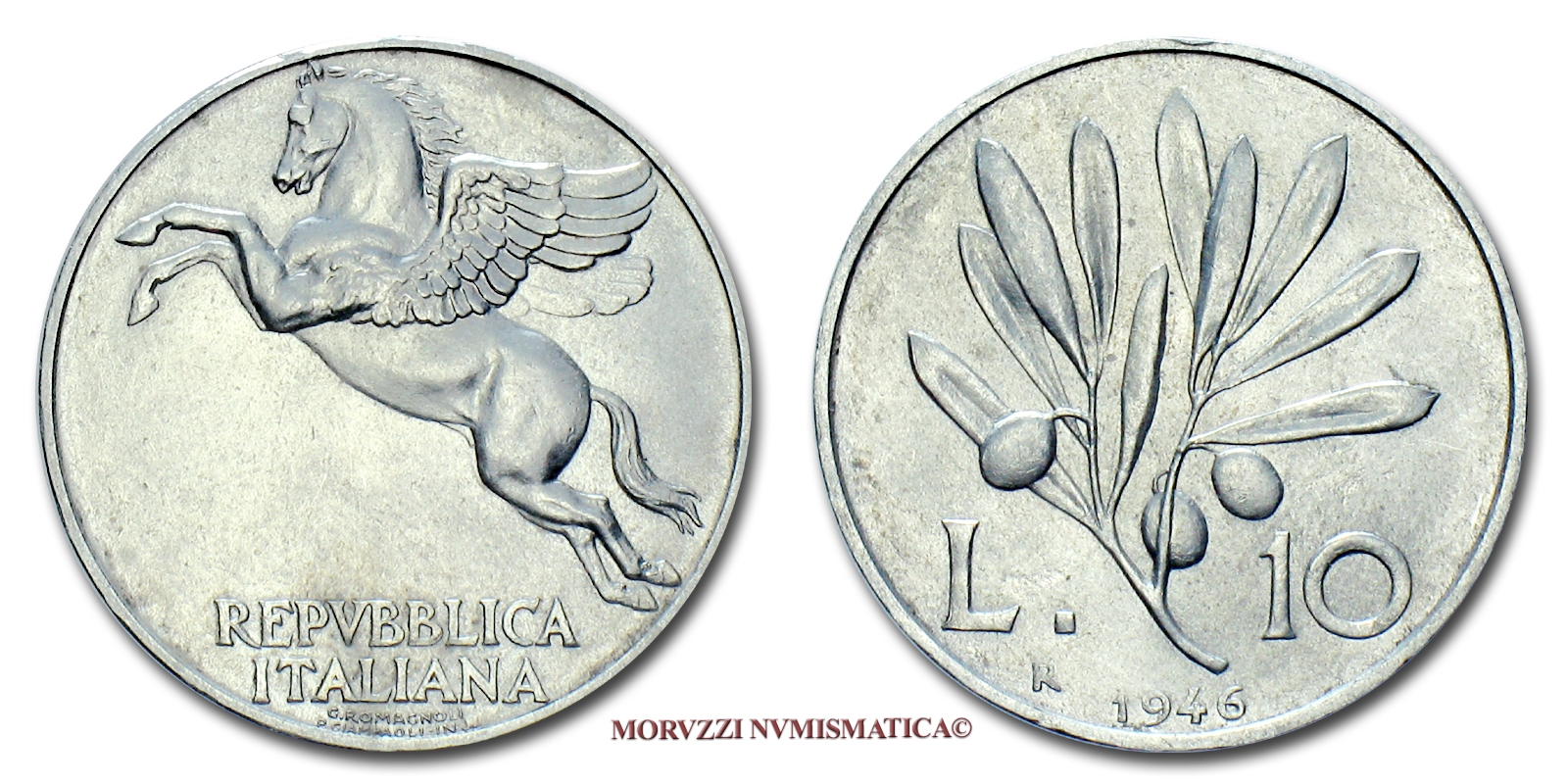 Italia, REPUBBLICA, Dal 1946, 10 LIRE, Olivo, Emissione: 1946, Zecca di Roma, Rif. bibl. Pagani, 2301; Metallo: IT, gr. 3,00, (MI115587), Diam.: mm. 29,04, qFDC, (R)