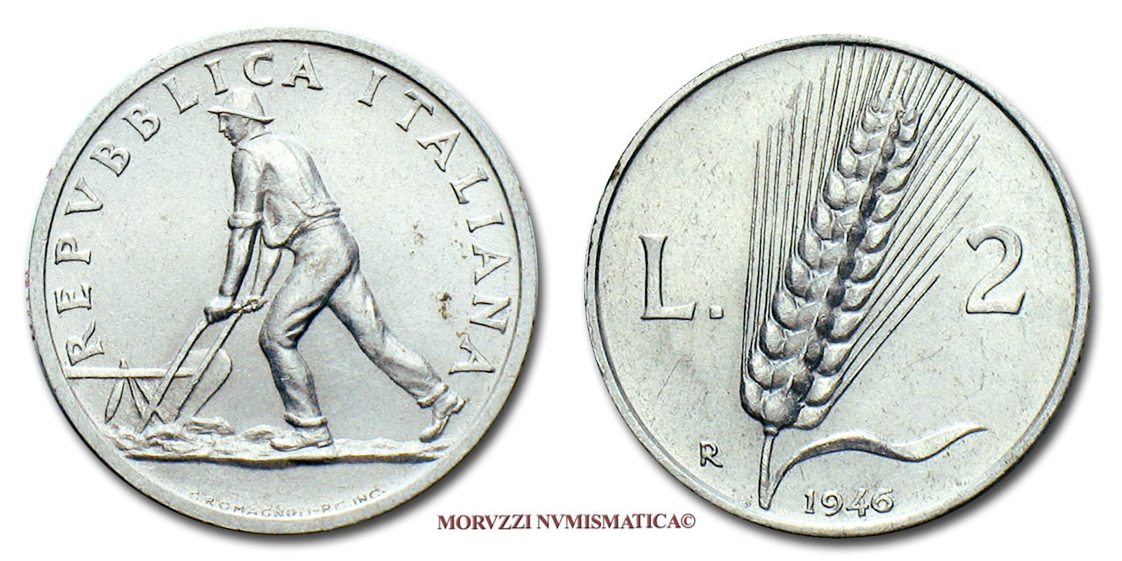 Italia, REPUBBLICA, Dal 1946, 2 LIRE, Spiga, Emissione: 1946, Zecca di Roma, Rif. bibl. Pagani, 2401; Metallo: IT, gr. 1,76, (MI129772), Diam.: mm. 23,89, SPL, (R)