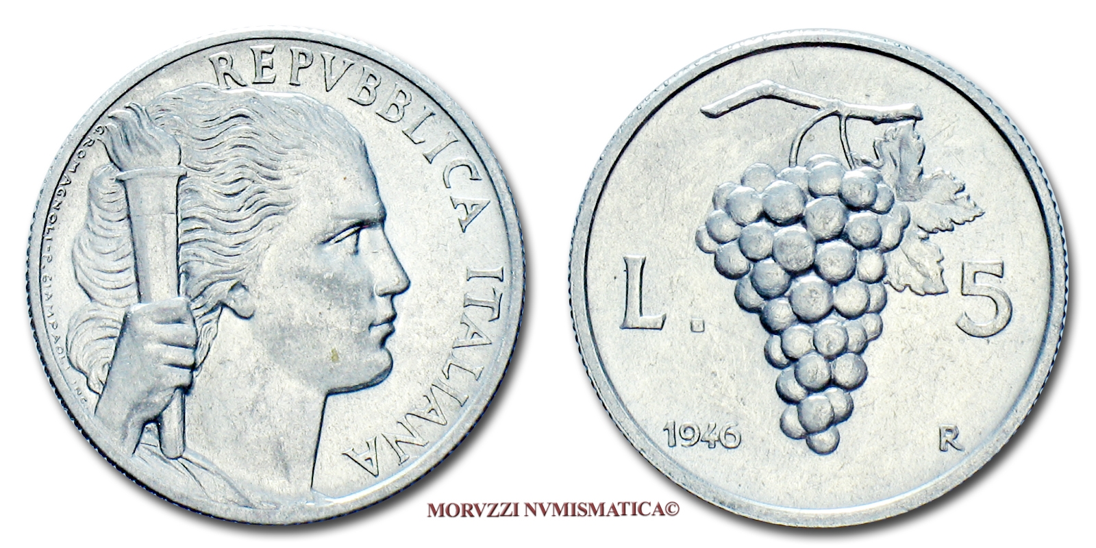 Italia, REPUBBLICA, 5 LIRE, Uva, Emissione: 1946, Zecca di Roma, Rif. bibl. Pagani, 2351; Metallo: IT, gr. 2,51, (MI84443), Diam.: mm. 26,76, mSPL, (RR)