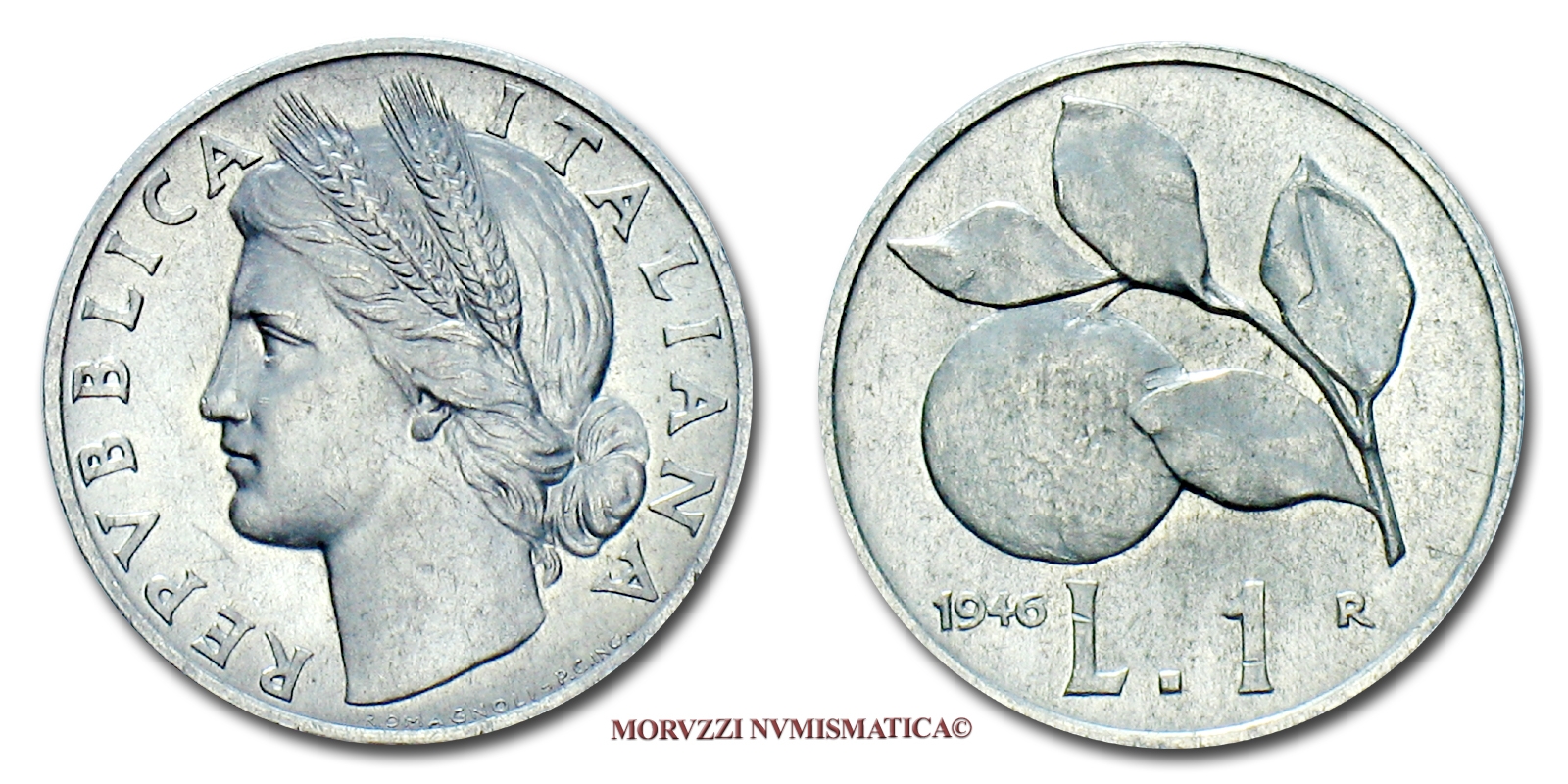 Italia, REPUBBLICA, Dal 1946, LIRA, Arancia, Emissione: 1946, Zecca di Roma, Rif. bibl. Pagani, 2451; Metallo: IT, gr. 1,25, (MI99532), Diam.: mm. 21,68, SPL, (R)