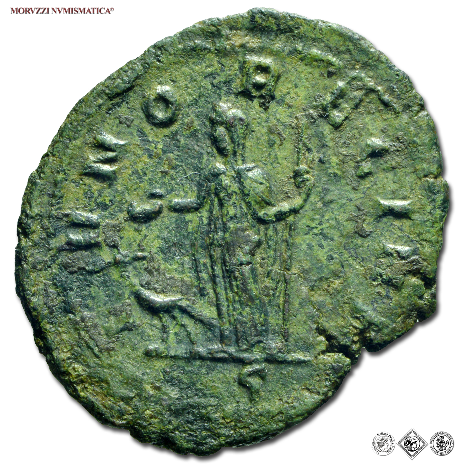 Impero Romano, SEVERINA, Moglie di Aureliano, 270-275 d.C., ASSE, Emissione: 270-275 d.C., D/ SEVERINA AVG, busto diademato e ammantato a destra, R/ IVNO REGINA / #G#, Giunone stante a sinistra con patera nella destra e scettro nella sinistra, Zecca di Roma, Rif. bibl. R.I.C., 7/S; Cohen, 9/Fr.6; Metallo: AE, gr. 6,79, (MR145852), Diam.: mm. 28,44, SPL, (R)