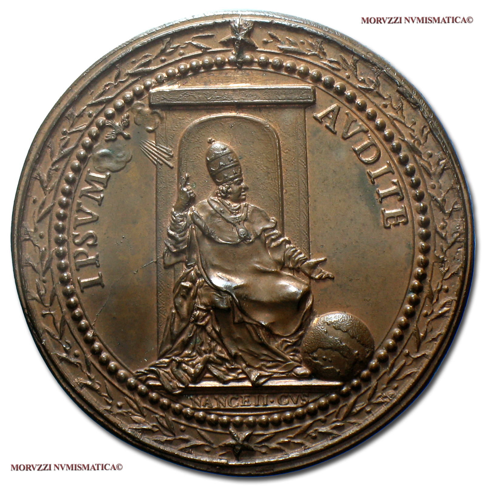 Stato Pontificio, CLEMENTE XI, Albani, 1700-1721, MEDAGLIA STRAORDINARIA IN BRONZO (contorno floreale), Controversia con l'Austria, Emissione: 1706 A VI, D/ CLEMENS • XI • PONT • M • A • VI, busto a d. con triregno e piviale; sotto: S.VR, R/ IPSVM AVDITE, il Papa in trono, ai suoi piedi il Mondo; in esergo: NANCEJI • CVS, Opus Ferdinando De Saint-urbain, Rif. bibl. Miselli, 57; Metallo: AE, gr. 38,45, (MP141264), Diam.: mm. 41,40, qFDC, (RR)