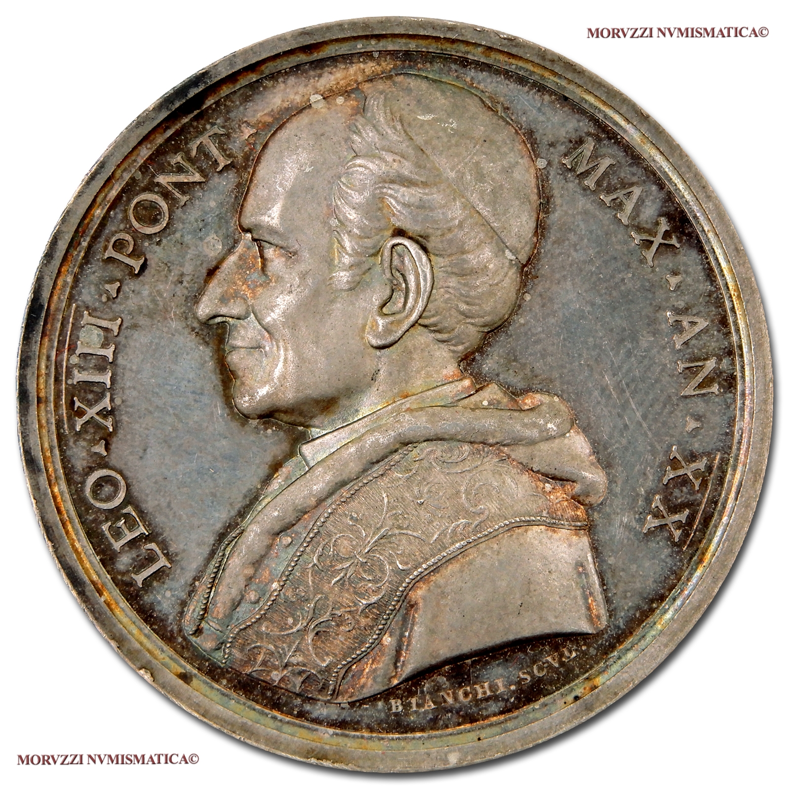 Stato Pontificio, LEONE XIII, Pecci,1878-1903, MEDAGLIA ANNUALE IN ARGENTO, Fondazione del Collegio Leoniano in Anagni, Emissione: AN XX (1897), D/ LEO • XIII • PONT • MAX • AN • XX •, busto con berretto, mozzetta e stola a s.; BIANCHI. SCUL. sotto, R/ DOCTRINIS • OPTIMIS • IN • CLERO • PROVEHENDIS, prospetto del Collegio Leoniano; COLLEGIVM • LEONIANVM / ANAGNIAE / I. OLIVIERI. ARCH. in esergo, Opus Francesco Bianchi, Rif. bibl. Bart., E897; Metallo: AR, gr. 35,32, (MP128963), Diam.: mm. 43,58, FDC, (NC)