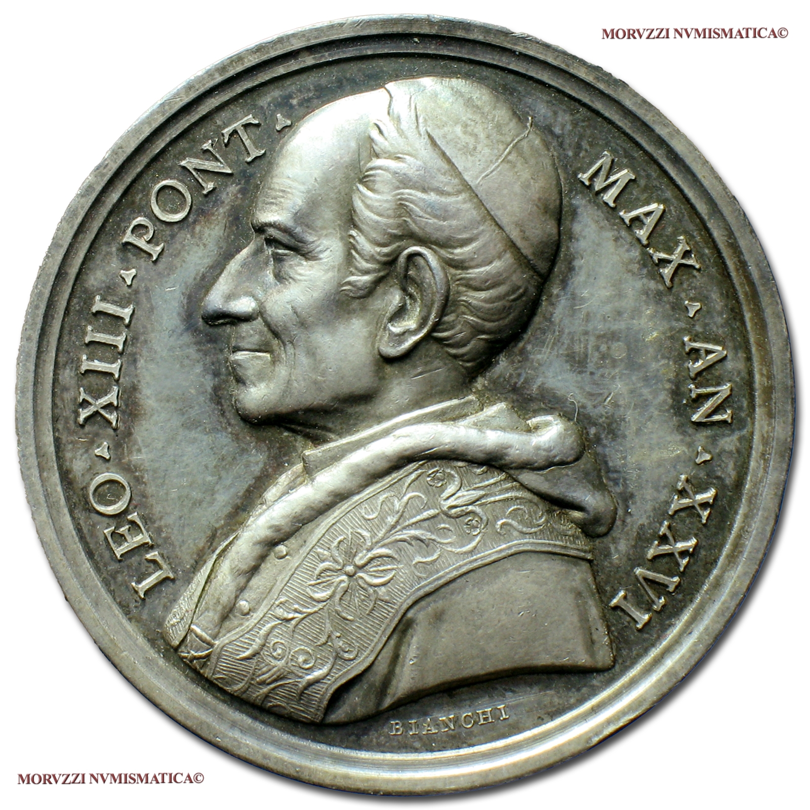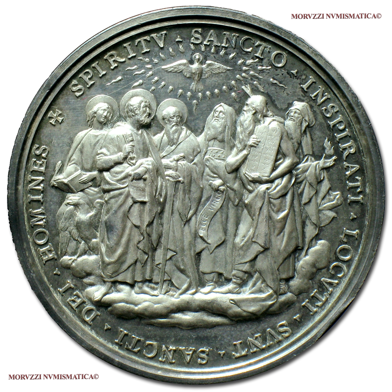 Stato Pontificio, LEONE XIII, Pecci, 1878-1903, MEDAGLIA ANNUALE IN ARGENTO, Commissione per gli studi biblici, Emissione: AN XXVI (1903), D/ LEO • XIII • PONT • MAX • AN • XXVI, busto con mozzetta, berretto e stola a s.; BIANCHI sotto, R/ + SPIRITV • SANCTO • INSPIRATI • LOCVTI • SVNT • SANCTI • DEI • HOMINES, sei Santi sulle nubi radiati dalla colomba dello Spirito Santo, Opus Francesco Bianchi, Rif. bibl. Bart., E903; Metallo: AR, gr. 36,09, (MP125442), Diam.: mm. 43,50, qFDC, (NC)
