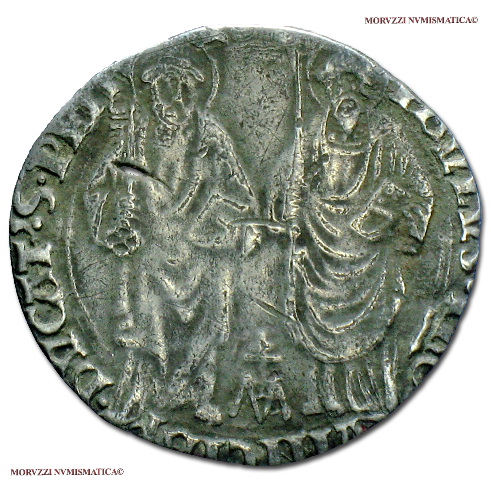 Stato Pontificio, PAOLO II, Barbo, 1464-1471, GROSSO, Senza data, D/ • SECVNDVS • • PAVLVS • P P •, stemma semiovale in quadribolo, R/ S • PETRV • S • PAVLVS • DVCAT • SPOLET, i Santi Pietro e Paolo stanti di fronte; M nel campo in basso tra i due santi, Zecca di Spoleto, Rif. bibl. Muntoni, 80; Berman, 438; C.N.I., 6; Metallo: AR, gr. 2,83, (MX95989), Diam.: mm. 26,17, BB, (RRRR)