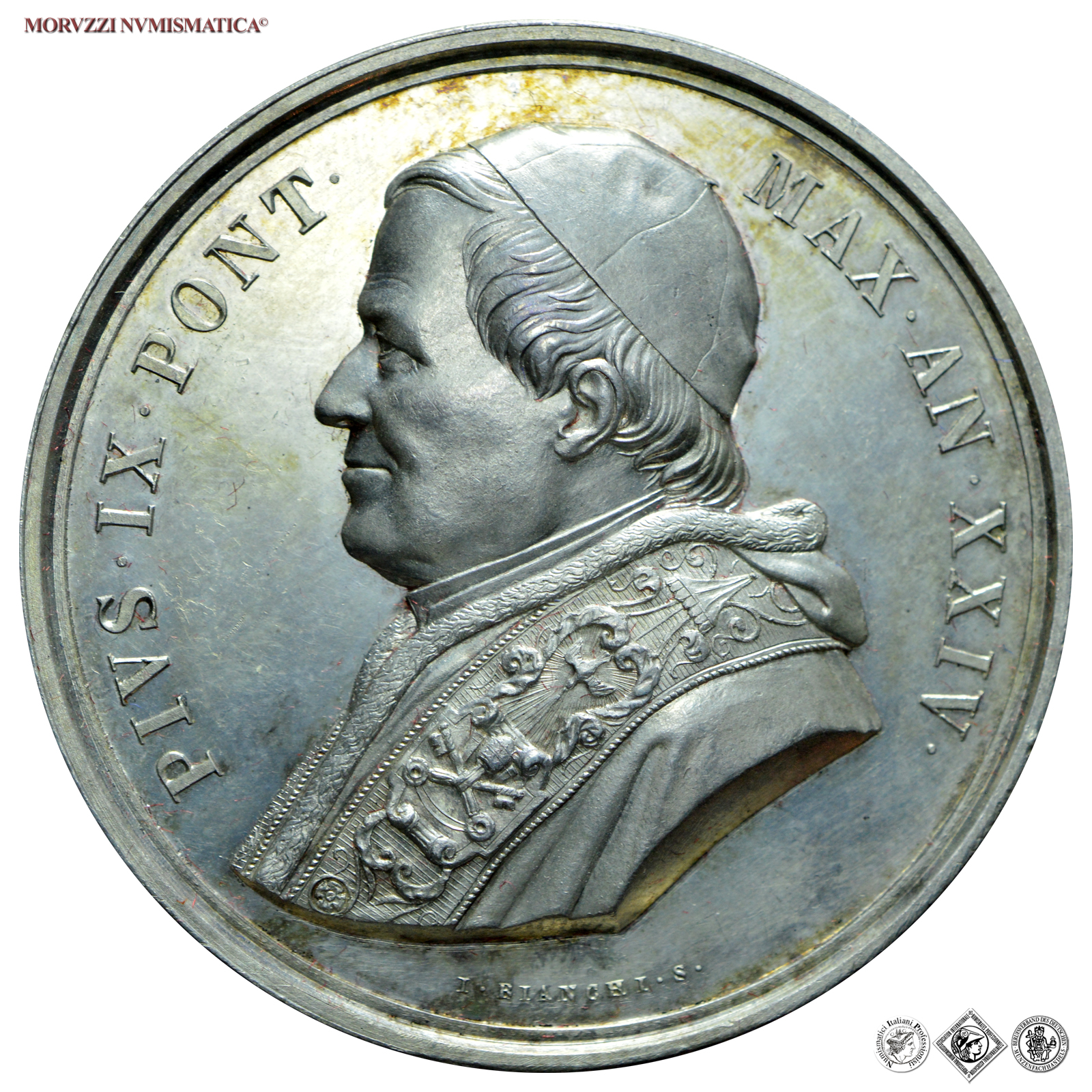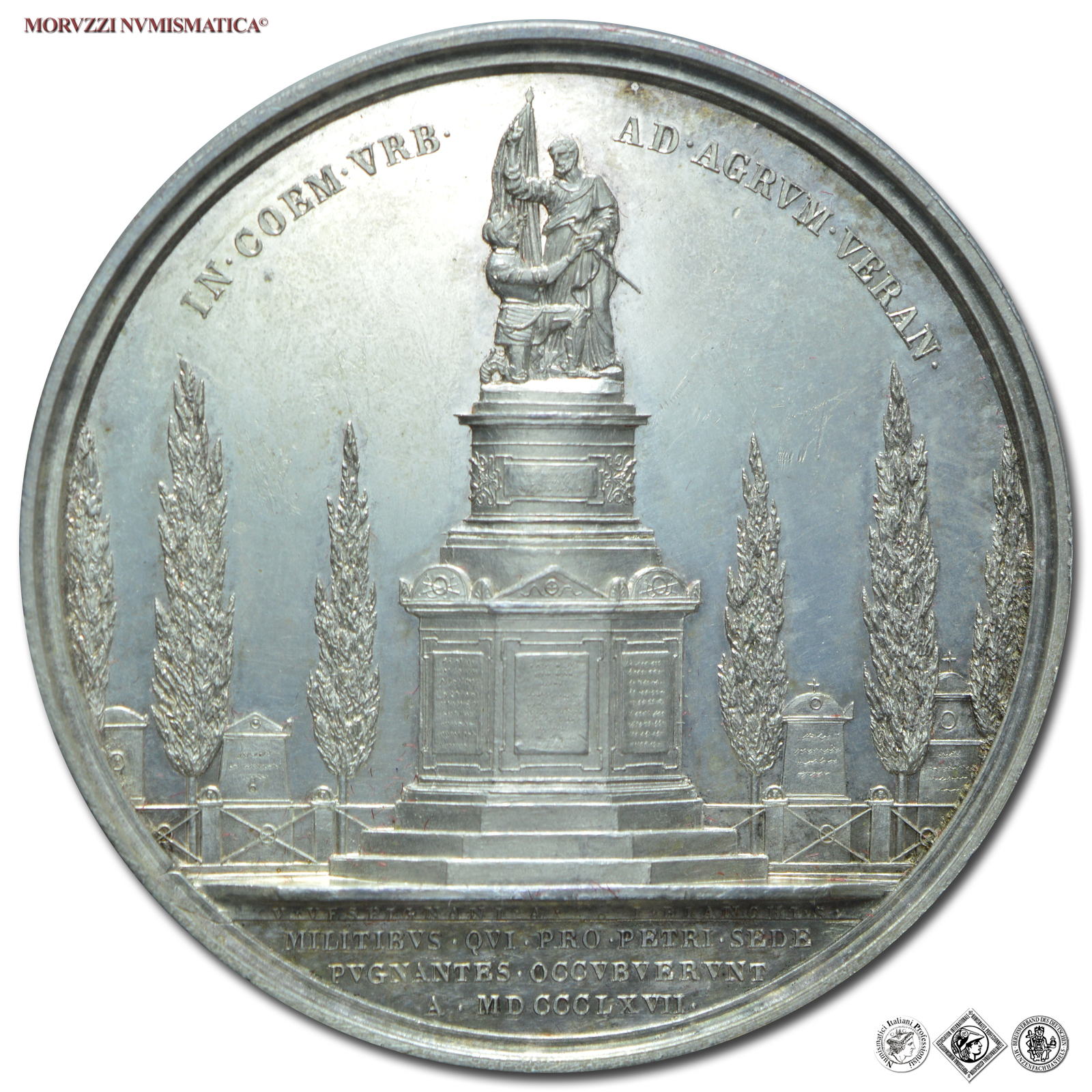 Stato Pontificio, PIO IX, Mastai Ferretti, 1846-1878, MEDAGLIA ANNUALE IN ARGENTO, Monumento ai caduti eretto al Campo Verano, Emissione: AN XXIV (1869), D/ PIVS • IX • PONT • MAX • AN • XXIV •, busto del Pontefice a s.; sotto: I • BIANCHI • S •, R/ IN • COEM • VRB • AD • AGRVM • VERAN •, monumento ai caduti per lo Stato Pontificio eretto nel cimitero del Verano; in esergo, su tre righe: MILITIBVS • QVI • PRO • PETRI • SEDE / PVGNANTES • OCCVBVERVNT / A • MDCCCLXVII, Opus Ignazio Bianchi, Rif. bibl. Bart., E869; Metallo: AR, gr. 34,58, (MP141747), Diam.: mm. 43,69, FDC, (R)