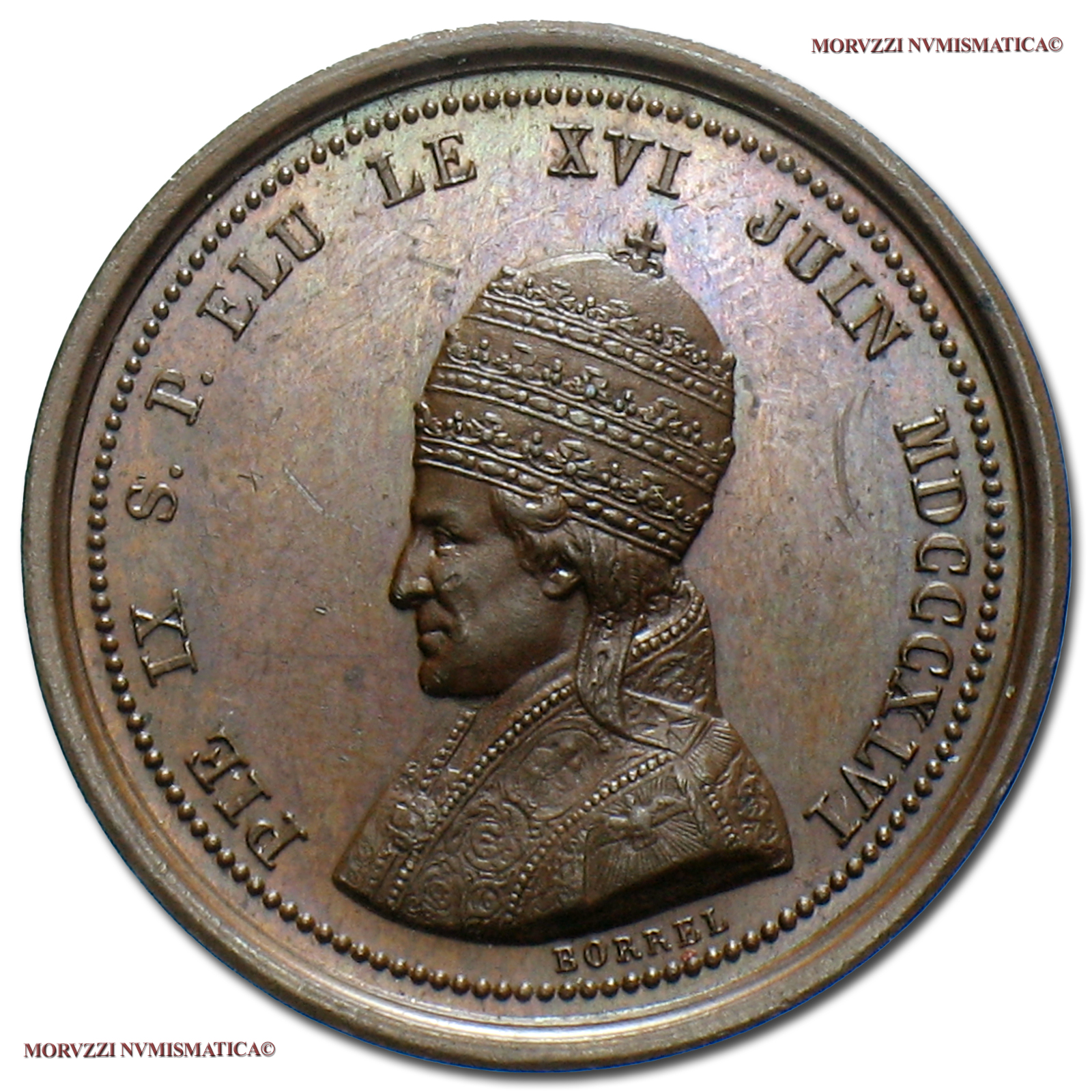 Stato Pontificio, PIO IX, Mastai Ferretti, 1846-1878, MEDAGLIA IN BRONZO, Giubileo episcopale - Jubilè, Emissione: 1847, D/ PIE IX S. P. ELU LE XVI JUIN MDCCCXLVI, busto a s. con triregno e piviale; sul taglio del busto: BORREL, R/ in alto: croce latina raggiante; nel campo: JUBILE' 1847 su due righe; in basso: chiavi incrociate legate da nastro, Opus Maurice Valentin Borrel, Rif. bibl. Bart., I-48; Metallo: AE, gr. 10,31, (MP141034), Diam.: mm. 25,81, qFDC, (R)