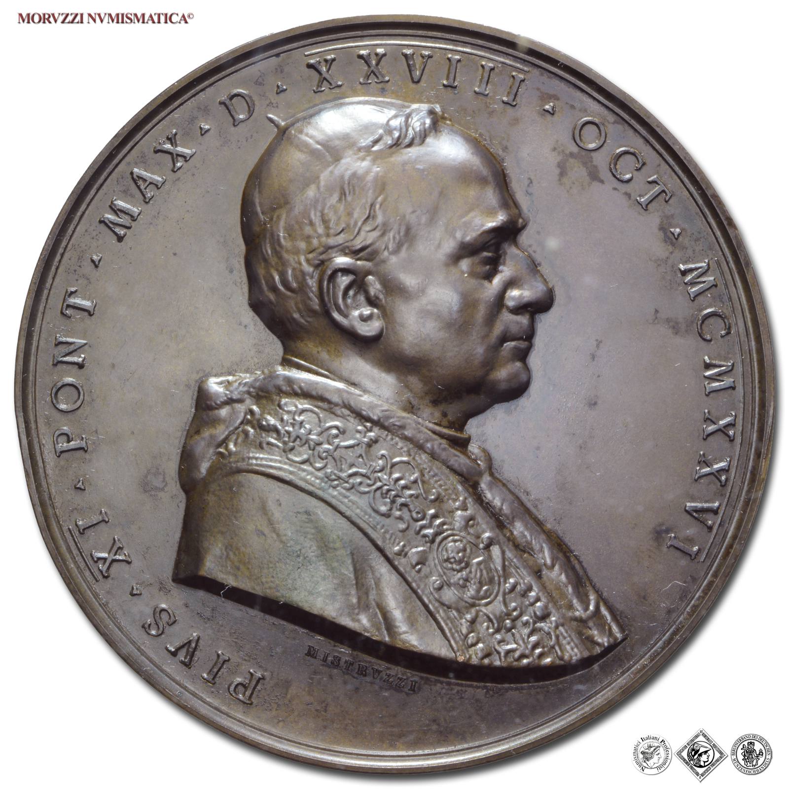 Stato Pontificio, PIO XI, Ratti, 1922-1939, MEDAGLIA IN BRONZO, Consacrazione Primi Vescovi Cinesi, Emissione: 1926, D/ PIVS • XI • PONT • MAX • D • XXVIII • OCT • MCMXXVI, busto a d. con berretto, mozzetta d'ermellino e stola; sotto: MISTRVZZI, R/ Scena della consacrazione; in esergo: SINENSES • SINENSIBVS / SEX • DATOS • EPISCOPOS / PRIMOS • CONSECRAVIT / -, Opus Aurelio Mistruzzi, Rif. bibl. CM, 138; Metallo: AE, gr. 152,84, (MP146992), Diam.: mm. 70,62, qFDC, (RR)