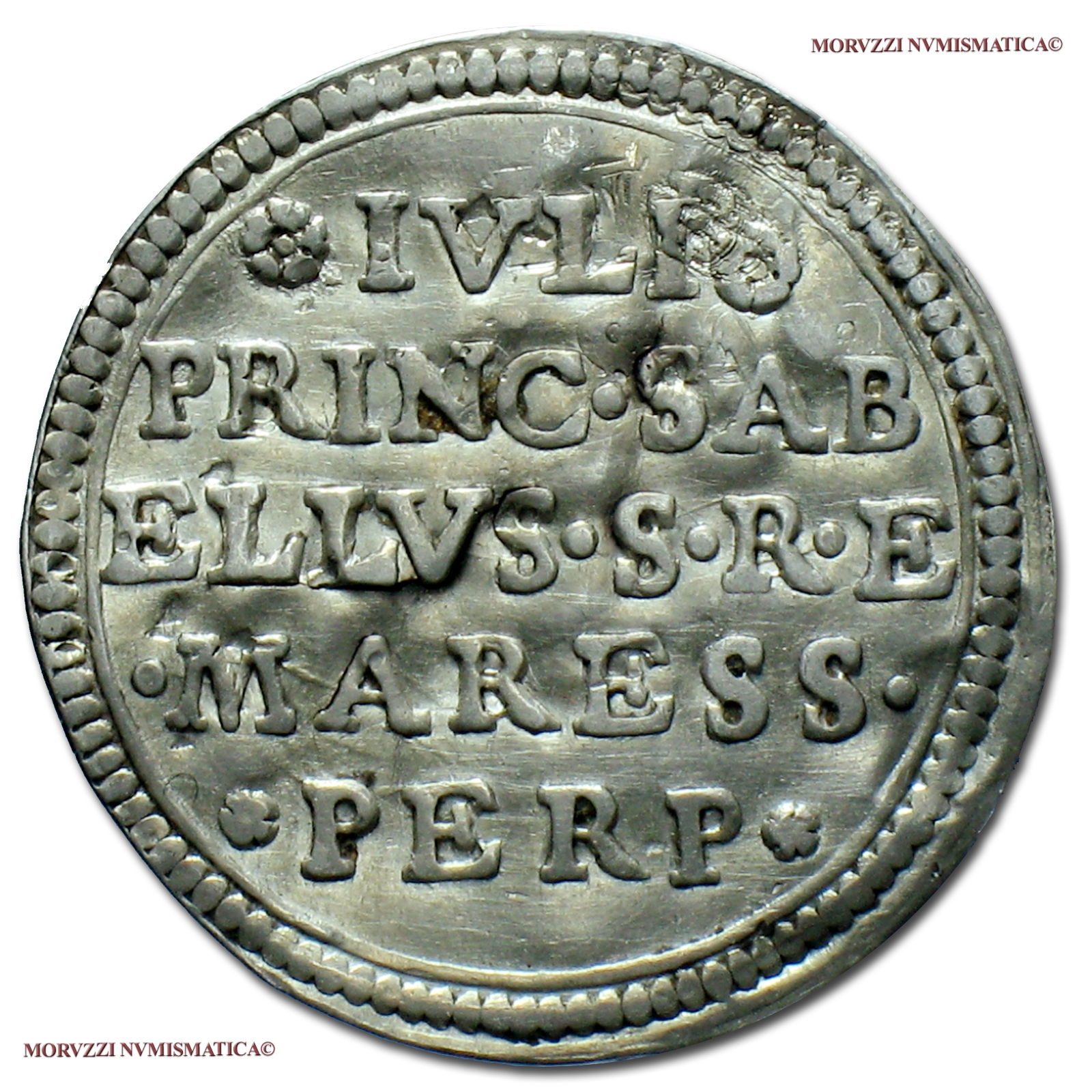 Stato Pontificio, SEDE VACANTE, MEDAGLIA IN ARGENTO, Maresciallo del Conclave Principe Giulio Savelli, Emissione: 1667, D/ stemma coronato cinto dalla collana del Toson d'oro, R/ * IVLIO / PRINC • SAB / ELLVS • S • R • E / • MARESS • / • PERP •, legenda su 5 righe, Rif. bibl. Carafa Jacobini, 1; Boccia, 9; Metallo: AR, gr. 2,92, (MP138246), Diam.: mm. 26,00, mBB, (RRRRR)