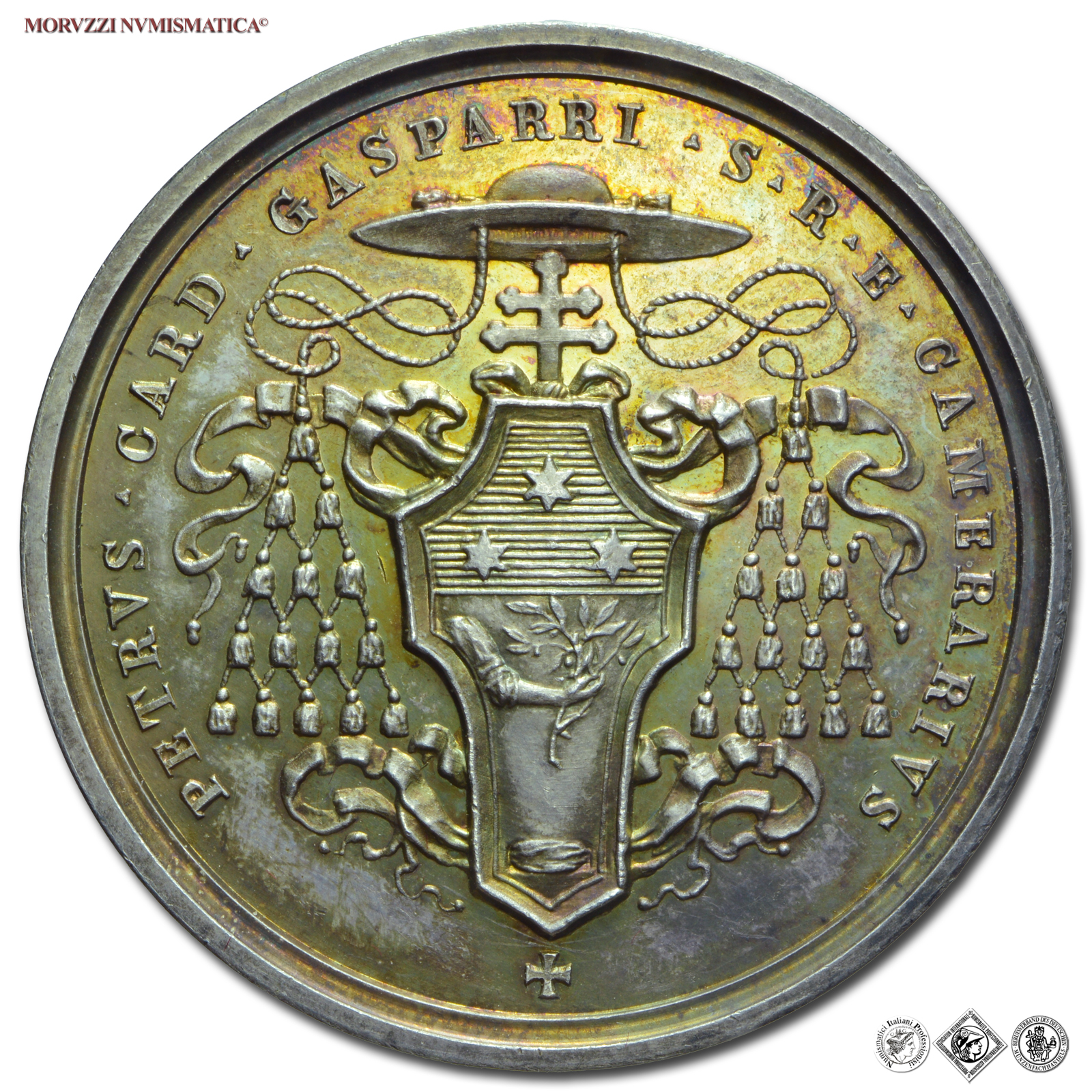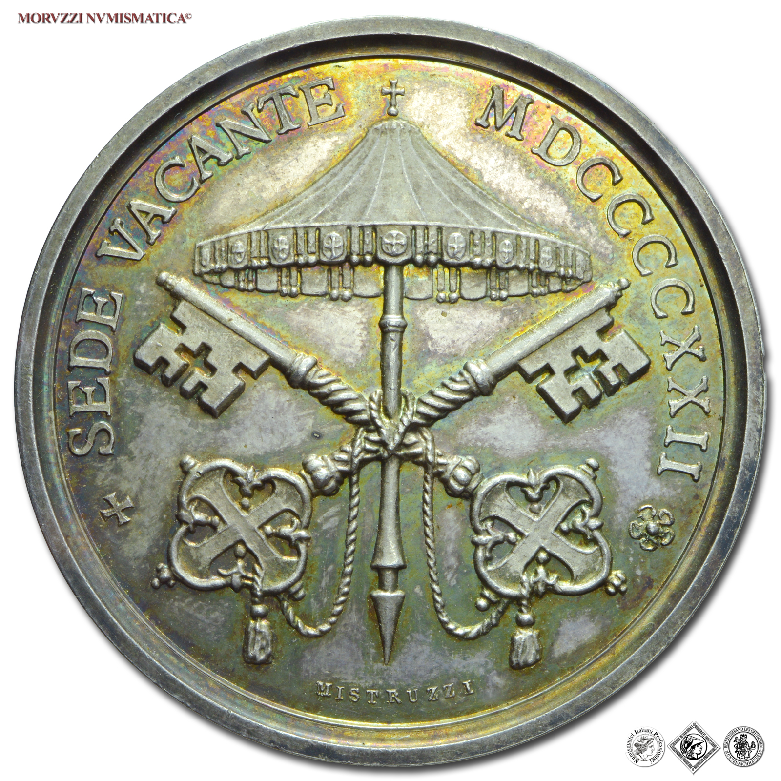 Stato Pontificio, SEDE VACANTE, 1922, MEDAGLIA IN ARGENTO, Camerlengo Cardinale Pietro Gasparri, Emissione: 1922, D/ ✠ SEDE VACANTE MDCCCCXXII *, ombrellone su chiavi decussate; sotto: MISTRUZZI, R/ PETRUS • CARD • GASPARRI • S • R • E • CAMERARIVS, stemma del Cardinale Gasparri tra nastri, sormontato da galero a 15 nodi e da tripla Croce; in basso: ✠, Opus Aurelio Mistruzzi, Rif. bibl. Boccia, 114; Calò, 10; Metallo: AR, gr. 24,07, (MP147434), Diam.: mm. 39,06, FDC, (RR)