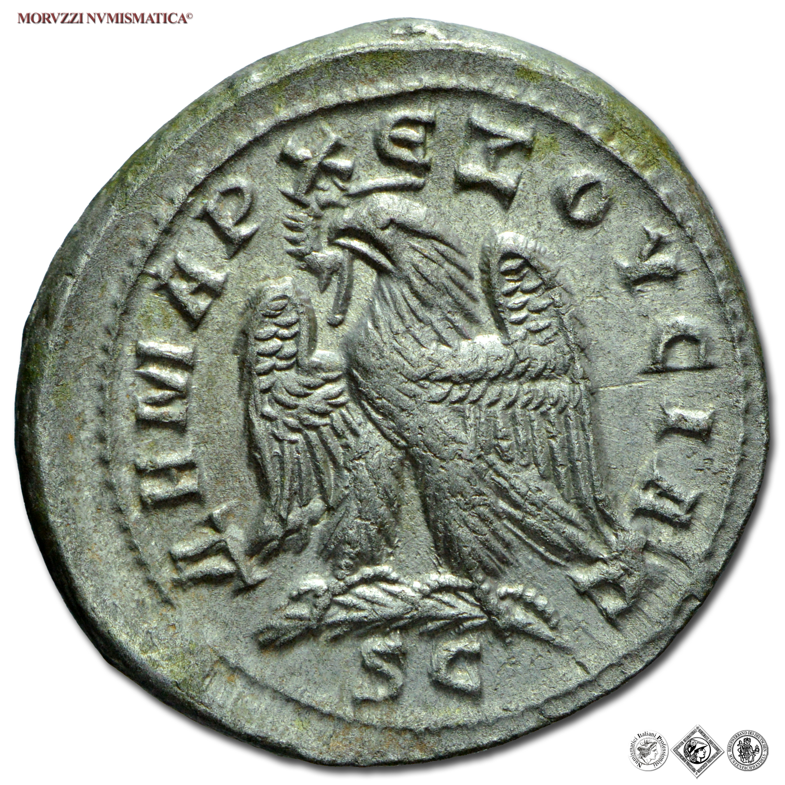 TRAIANO DECIO, TETRADRAMMA, 249-250 d.C., ΔHMAPX ЄΞOYCIAC / S C aquila ad ali aperte con corona nel becco, zecca di Antiochia in Siria, ARGENTO, qSPL, (Prieur 520) / monete romane imperiali provinciali antiche d'argento - moneta romana - Impero Romano)