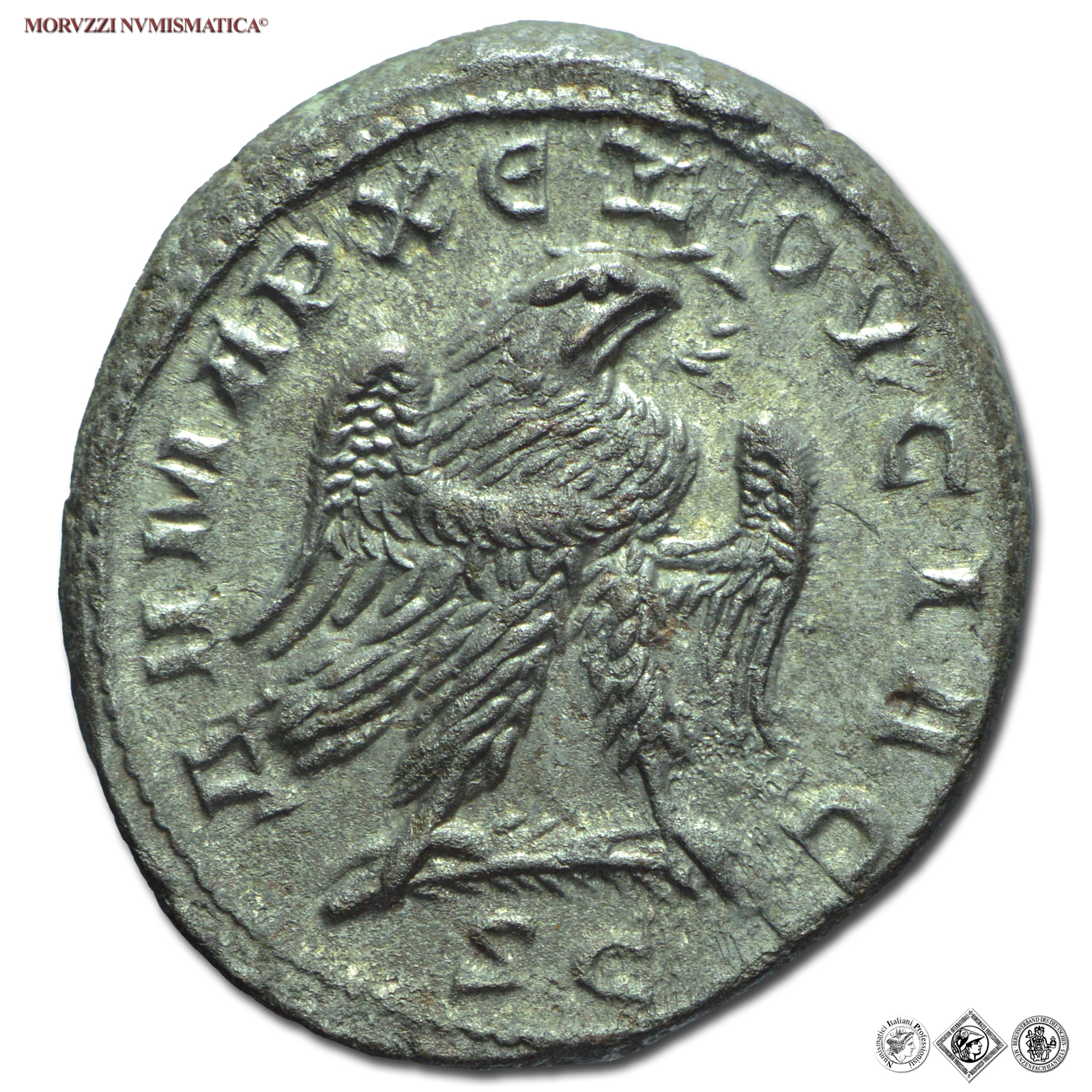 Impero Romano, Siria, TRAIANO DECIO, 249-251 d.C., TETRADRAMMA, Emissione: 250-251 d.C., D/ AYT K Γ MЄ KY TPAIANOC ΔЄKIOC CЄB, busto laureato con paludamento e corazza visto di spalle a destra, R/ ΔHMAPX ЄΞOYCIAC / S C, aquila stante di fronte su un ramo di palma ad ali aperte volta a destra con corona nel becco, Zecca di Antiochia*, Rif. bibl. Prieur, 575; Metallo: AR, gr. 12,72, (MR70576), Diam.: mm. 24,74, SPL, (R)